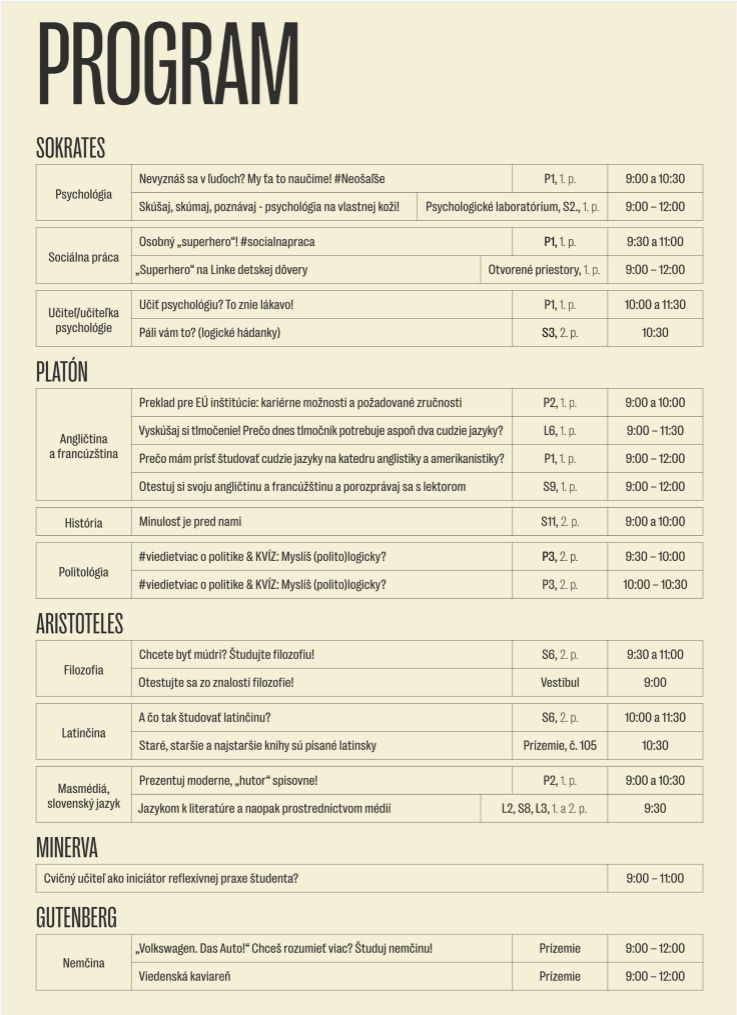 Filozofická fakulta UPJŠ v Košiciach srdečne pozýva širokú verejnosť na Deň otvorených dverí FF UPJŠ, ktorý sa uskutoční v piatok 9. 2. 2024 od 9.00 hod. v areáli fakulty na Moyzesovej 9 v historickom centre Košíc. Pre záujemcov o vysokoškolské štúdium sme pripravili zaujímavý program.