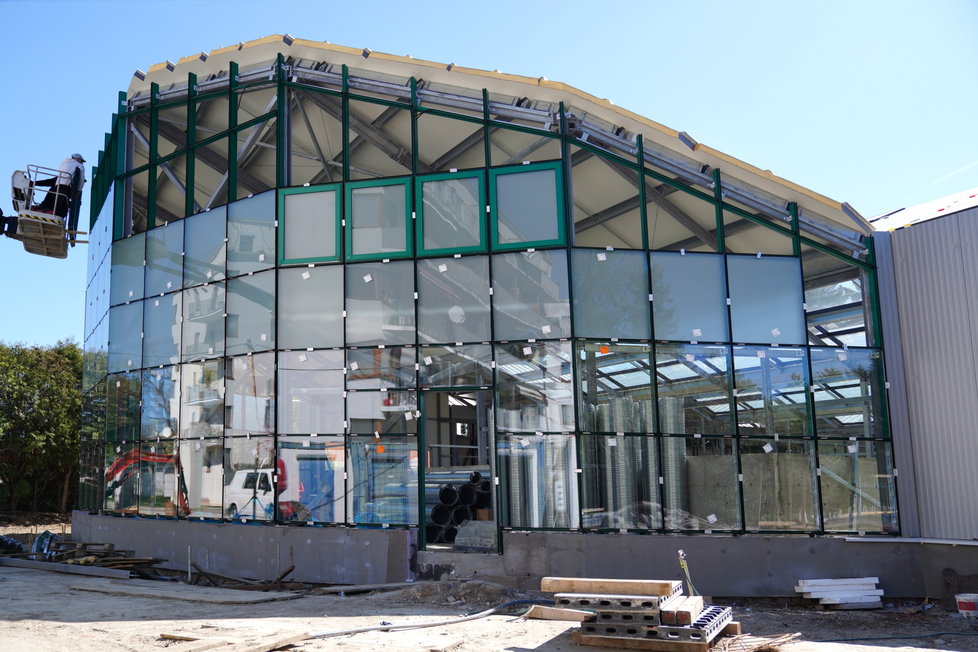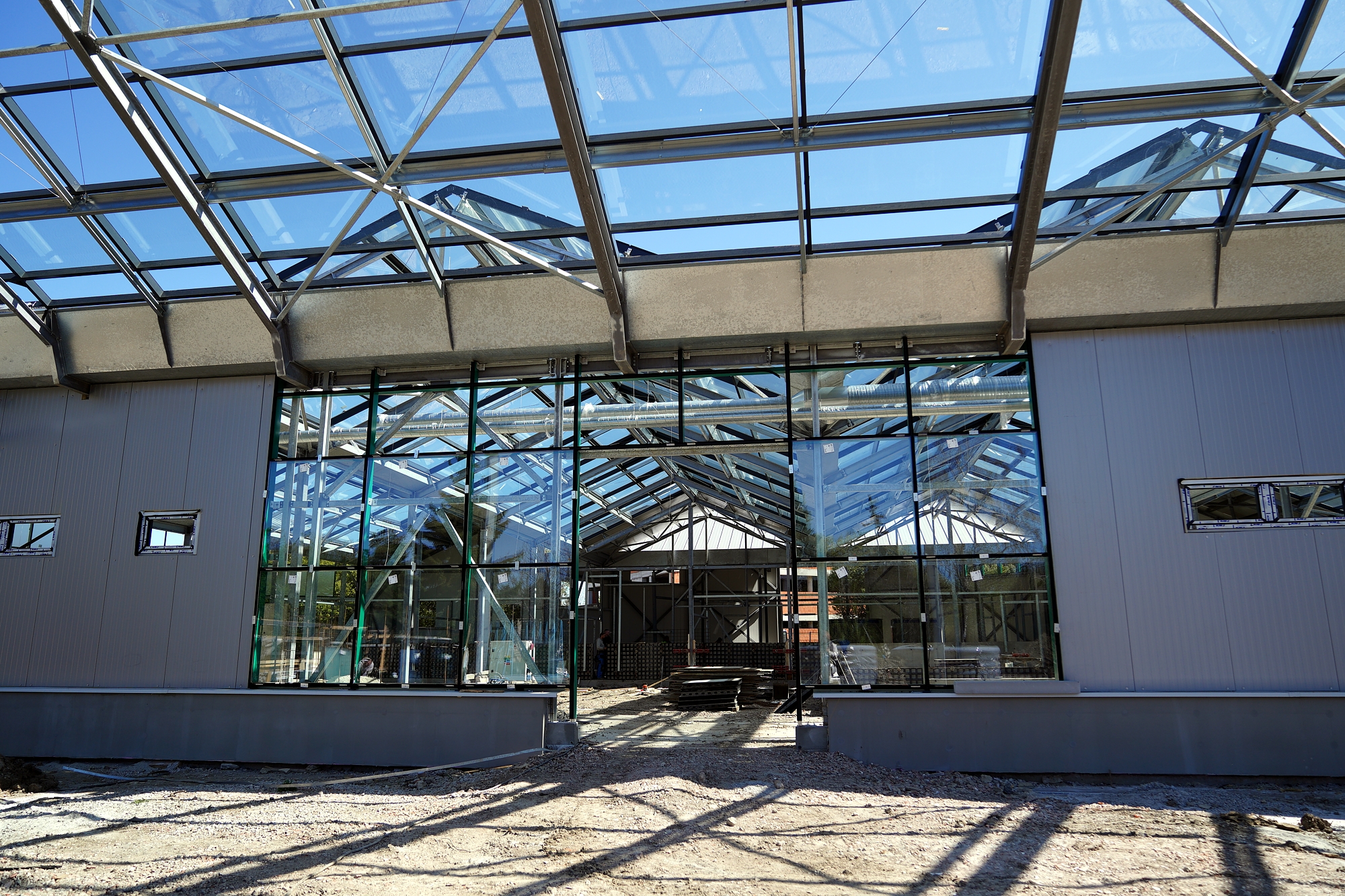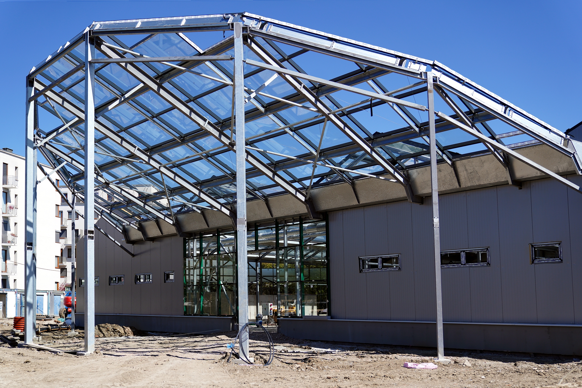 Stavba je riešená ako prízemná jednopodlažná budova so šikmou strechou a oceľovou nosnou konštrukciou, zastrešená celopresklenými sedlovými skleníkovými strechami. Pôdorys má štvorcový tvar s polkruhovými prístavbami, pričom maximálne vonkajšie rozmery dosahujú 57,3 × 47,7 metra.